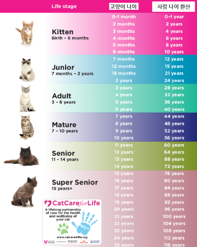 고양이 2살이면 사람나이로 24살이라니, 고양이 성장 속도가 매우 빠른 것 같습니다.