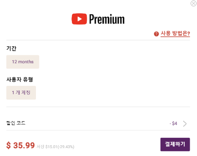 즉, 1년에 $39.99, 약 57800원 결제를 하고 1년간 유튜브 프리미엄으로 이용하는 것입니다.