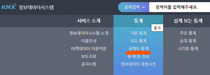 1) 사이트 접속 후, 통계 -> 공매도 통계 클릭!