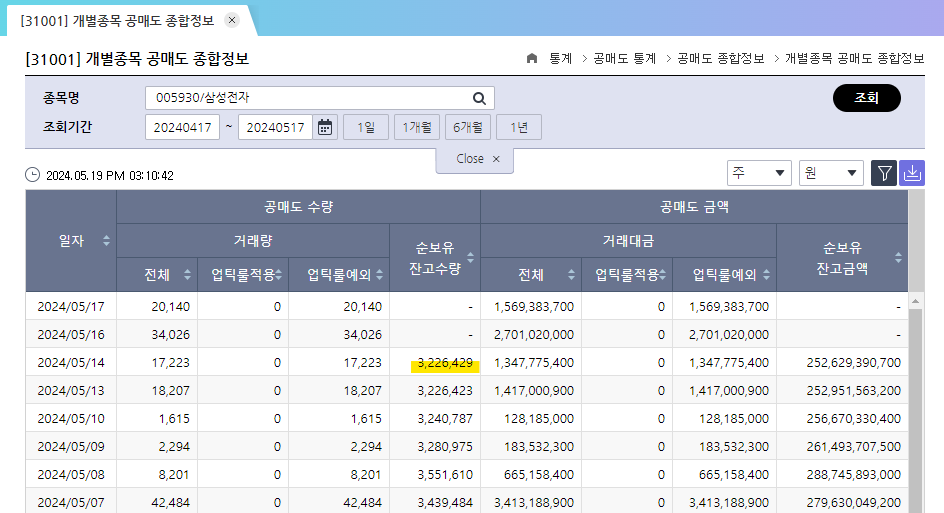 저는 삼성전자를 검색해봤습니다. 24년 5월 14일 삼성전자의 공매도 잔고 수량은 3,226,429주 입니다.