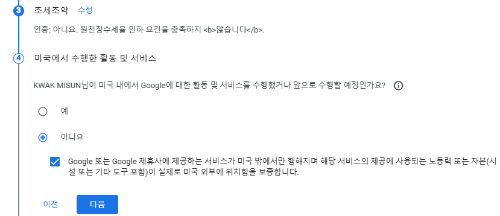 4) 미국에서 수행한 활동 및 서비스? 국내거주라면 아니요 선택 후 하단 박스 체크해주세요.