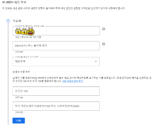 1) 세금 ID : 개인 영문 이름(HONG GILDONG 에드센스 결제수단에 등록된 영문명과 똑같이 적어주세요!), 대한민국 선택 후 다음