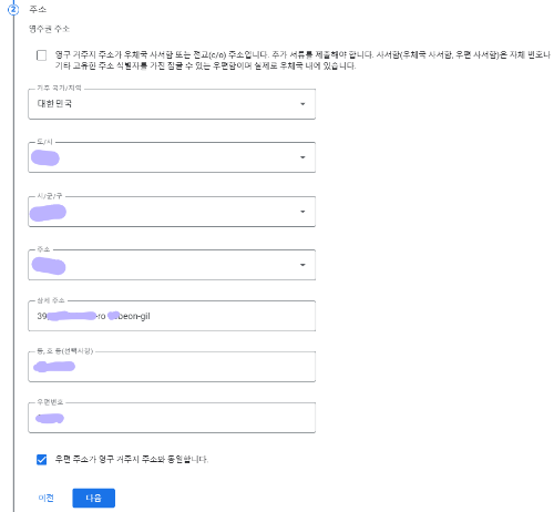 우편번호 입력 및 우편 주소가 영구 거주지 주소와 동일합니다에 체크 후 다음으로 넘어갑니다.