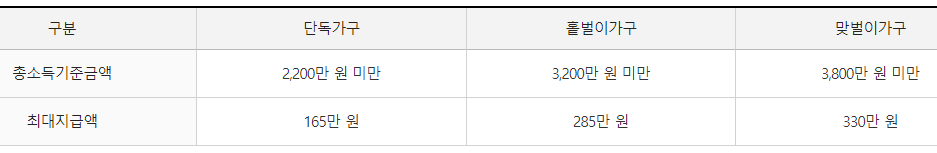 가구 유형에 따라 총소득기준금액이 표와 같이 해당되는 경우 신청 자격이 주어집니다.