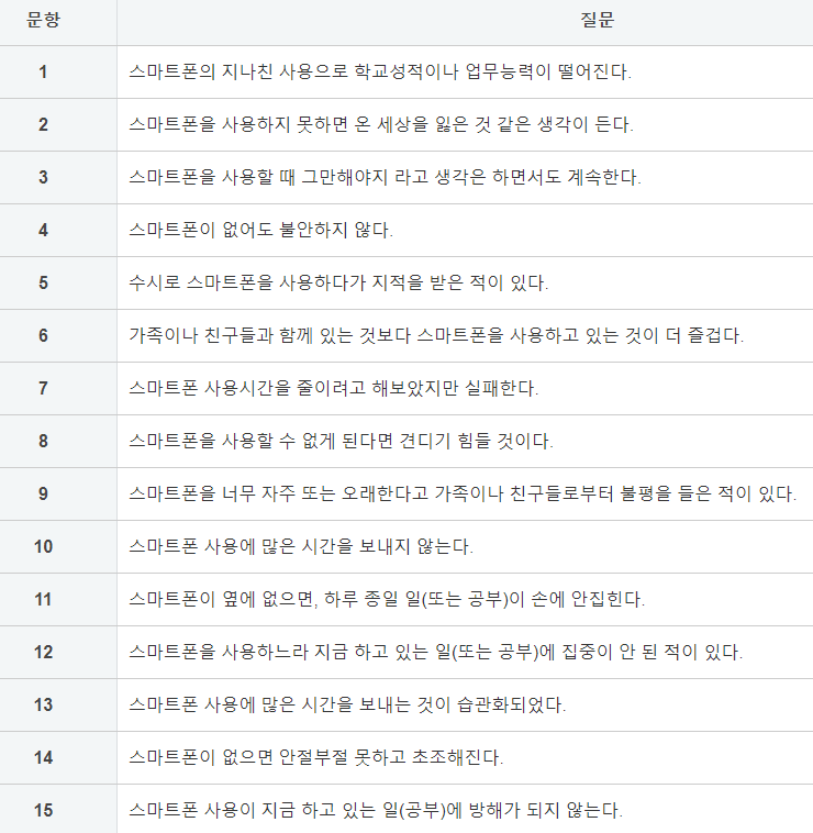 3. 문제적 결과(serious consequences)는 스마트폰 이용으로 신체적, 심리적, 사회적 부정적 결과를 경험함에도 스마트폰을 지속적으로 이용하는 것을 의미합니다. 피곤한데도 밤에 불끄고 스마트폰을 하고 결국 숙면을 방해받는 패턴을 생각해 볼 수 있습니다.