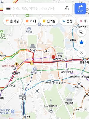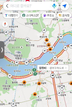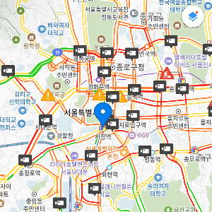 서울 도로가 빨갛습니다. CCTV 아이콘을 누르면 현재 교통 체증을 확인할 수 있고 도로 색상으로도 물론 가늠할 수 있습니다. 중간중간 느낌표 표시는 집회 등등 도로가 통제되는 상황을 확인할 수 있는 아이콘이고, 현재 공사하는 도로들도 알 수 있습니다.