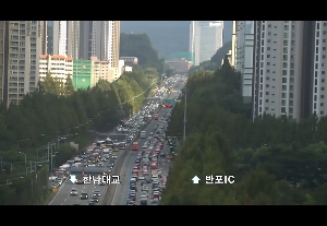 그러면 이렇게 도로 교통 정보와 CCTV를 확인할 수 있도록 지도가 설정됩니다. 동그란 CCTV 아이콘을 눌러주시면 사진처럼 해당 도로의 CCTV를 확인할 수 있습니다. 퇴근길이라 많이 막히는 걸 알 수 있네요~