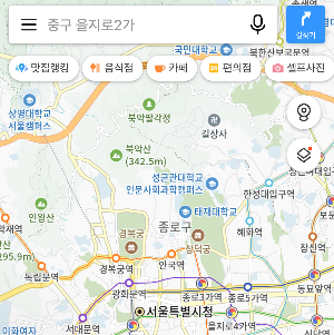 지도 어플들 사용방법은 거의 비슷한 것 같습니다. 티맵과 마찬가지로 카카오맵도 앱에 접속하여 우측 상단에 마름모꼴 두개 겹쳐진 아이콘을 눌러줍니다.