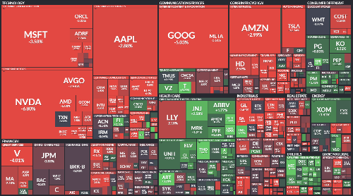 아마 미국주식에 관심있으신 분들은 한번쯤은 보셨을만한 사이트입니다. 바로 핀비즈인데요. 핀비즈는 사진처럼 S&P 500 기업들의 주식 등락률을 가시성 있게 한 화면에 표시하는 플랫폼으로 유명합니다. 최근 기술주들이 계속 하락하고 있는데요, 하락하는 기업들은 빨갛게 표시되고 또 저 네모칸의 사이즈는 시가총액을 의미합니다.