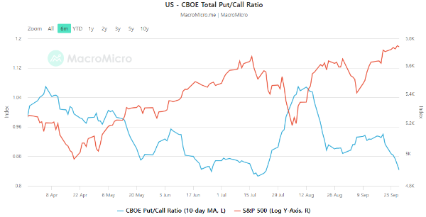 현재도 금리 빅컷 효과로 S&P500이 사상최고가를 계속 경신하고 있습니다. 반대로 풋콜비율은 매우 떨어지고 있는 모습을 보입니다. 지난 6,7월달의 상승장과 비슷한 모습입니다. 풋콜 비율이 계속 내려가다가 8월에 확 올라가는 모습을 보이는데요, 이때 S&P 500 지수는 엄청난 하락을 보여주었습니다. 이를 통해서 미국 시장의 분위기를 파악할 수 있기 때문에 풋콜비율을 참고하시면 좋습니다.