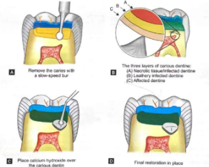 상기 사진처럼 충치가 아래 신경(빨간색)을 침투하지 않았다면 부분적으로 보호하는 약재로 덮어주는 치료를 합니다.