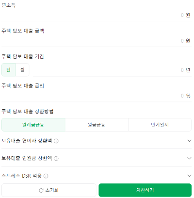 9월부터 스트레스 DSR 2단계로 적용될 것으로 보이며, 연소득, 주담대 금액, 대출 기간, 금리를 입력하시고 원리금 상환방법 및 스트레스 DSR 적용을 누르셔서 금리를 골라주시면 됩니다.