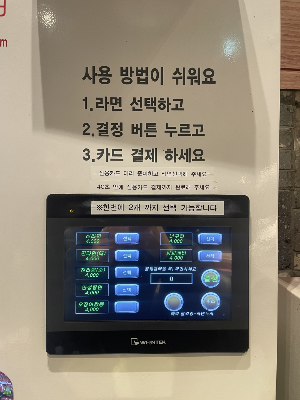 먼저 라면을 선택 후 결정 버튼을 누른 후 카드를 40초안에 꽂아주시면 결제 완료됩니다.