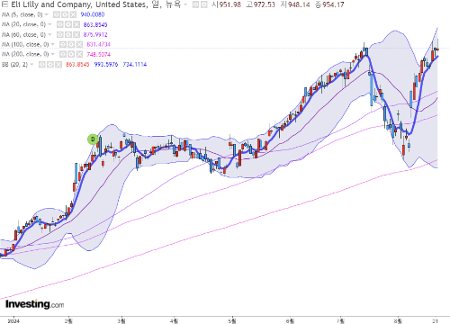 최근 발표된 2024년 2분기 실적발표에서 주당 순이익이 $3.86으로 목표치인 $2.6을 48.5% 상회하였습니다. 덕분에 최근 시장의 큰 하락에도 홀로 살아남아 저의 계좌를 지켜주었습니다. (릴리야 고마와) 현재 주가는 $950 정도에서 지지를 받고 있으며 예상 목표 주가는 $1003입니다.