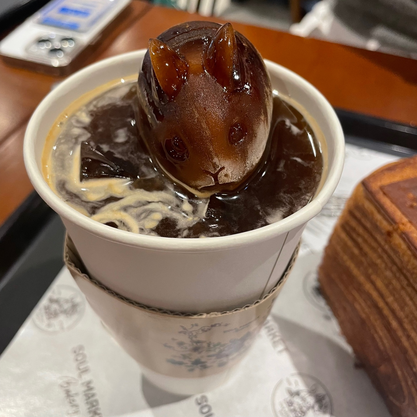 래빗카노 디카페인 입니다. 귀여운데 징그러운 느낌. 저걸 어떻게 먹을지 처음엔 좀 망설여졌어요. 눈빛이 너무 아련하네요. 맛은 아이스 아메리카노랑 똑같습니다.