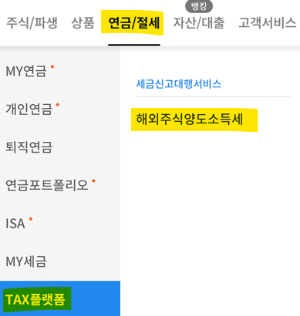 2. 메뉴>연금/절세>TAX 플랫폼>해외주식양도소득세 접속