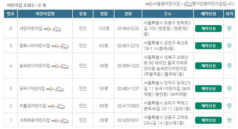 현재 이용가능한 어린이집은 지혜로운어린이집, 리틀짐어린이집, 당곡1어린이집, 숲속반디어린이집, 동화나라어린이집, 세인어린이집으로 총 6개입니다.