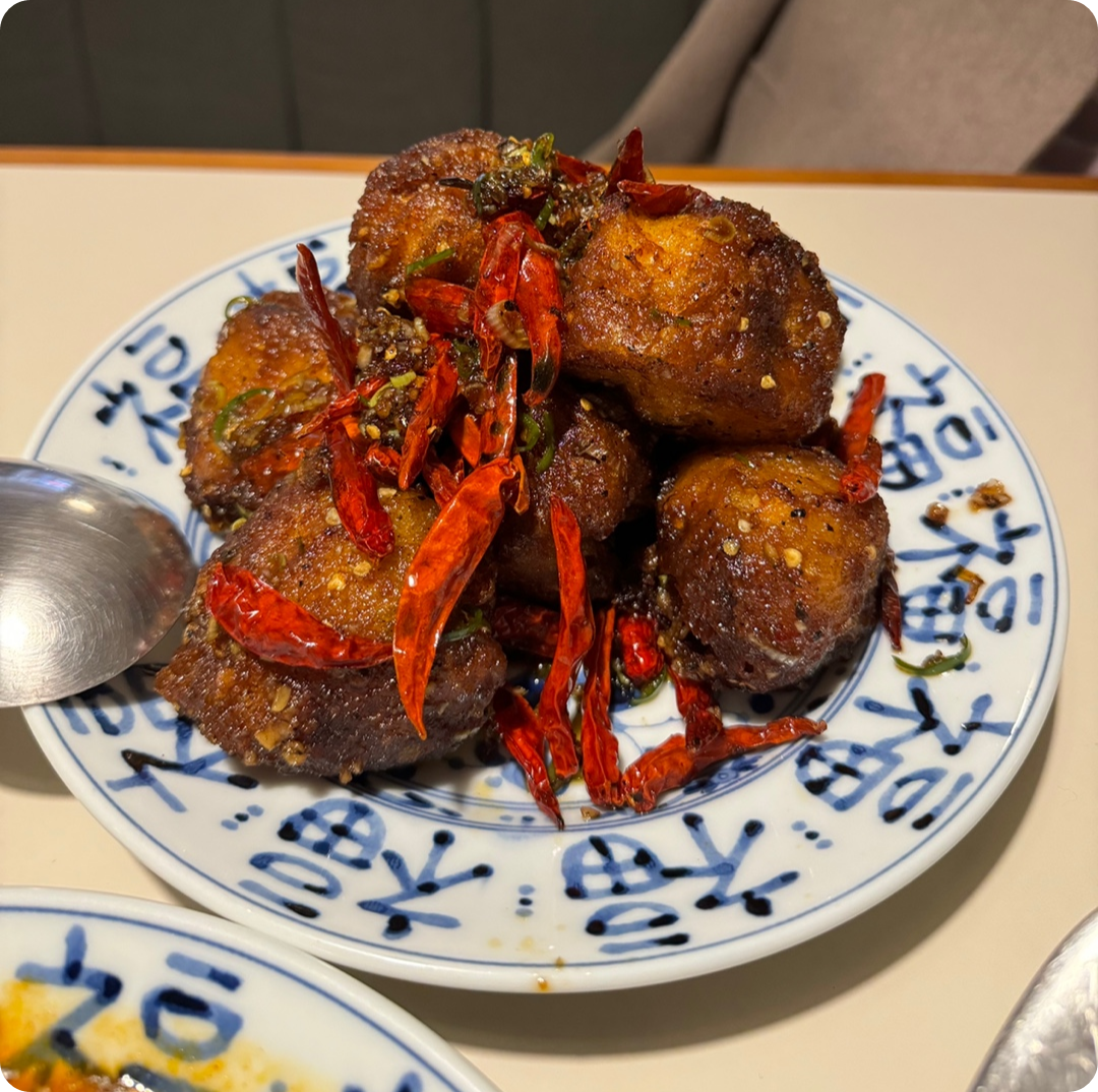 평상시 접해본 가지 요리라고는 어향가지밖에 없는데, 느낌이 좀 달랐다. 두툼하고 따뜻하고 겉바속촉!! 아래 마라소스에 찍어먹으면 좋을듯하다. 원래 고수가 들어가기 때문에 따로 달라고 요청하면 따로 접시에 담아서 주신다. 고수랑 같이 먹어도 맛있다! 어휘력 문제로 더 이상은 맛 묘사를 못하겠다.