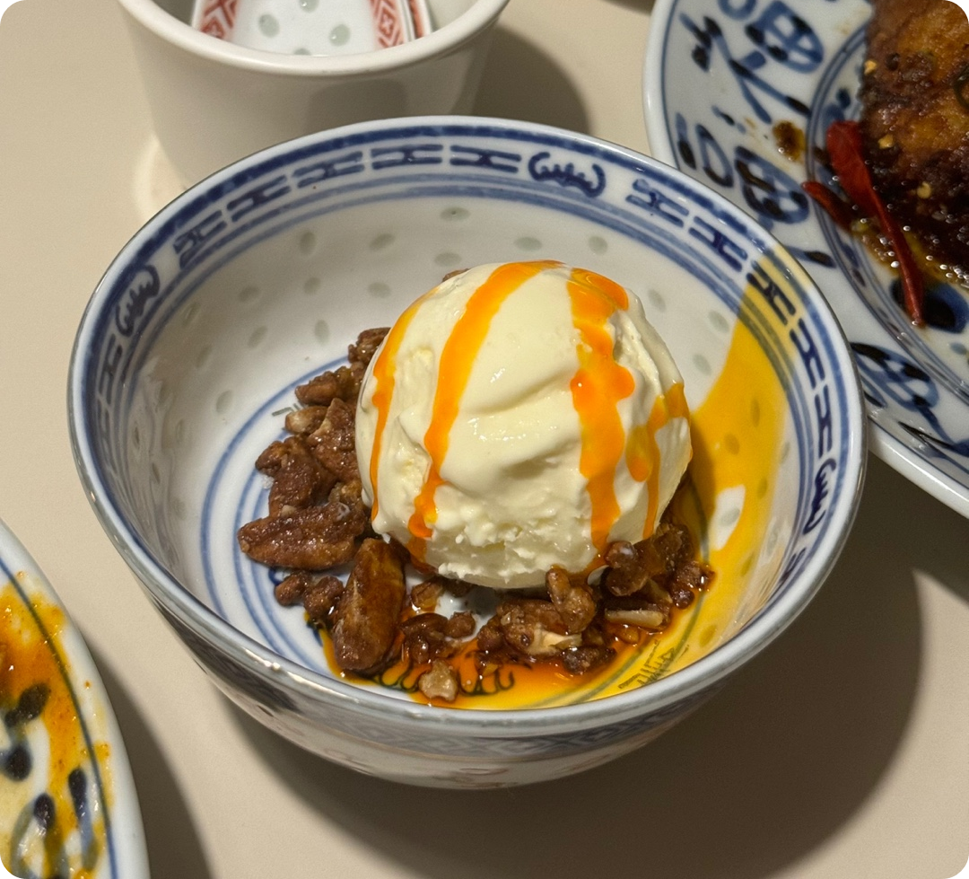 도대체 고추기름 아이스크림이 뭘까? 궁금해서 주문했다. 이거 중국분들은 이렇게 드시는건가? 실망스러웠다. 희안한 맛이다. 아래는 피칸이 깔려있고 바닐라 아이스크림 한스쿱에 고추기름을 둘러놓았는데 솔직히 그냥 바닐라 아이스크림 먹고싶었음. 게다가 8,000원이라는 가격이 너무 의뭉스러웠다. 호기심에 우리처럼 낚인 사람들 많을듯.. 결국 각자 한 스푼씩 먹고 녹을때까지 입도 안댔다. 바닐라 아이스크림 맛이 처음에 느껴지고 끝에 고추기름 톡 쏘는 맛이 올라온다. 별로 경험하지 않아도 될 듯 합니다. 정 궁금하시면 그냥 집에서 만들어드세요. 8000원은 안나올듯..