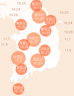 폭염으로 인해 전국의 단풍 시작도 늦어졌다고 합니다. 보통 9월 말부터 단풍이 시작하는데 제일 단풍이 먼저 시작되는 설악산을 제외하고 아직 단풍이 시작된 산이 없다고 합니다. 10월 기온도 높은 추세가 예상되어 단풍의 절정 시기가 더 늦어진다고 하는데요, 단풍 절정 시기는 설악산 10월 20일에서 시작하여 내장산, 무등산 11월 5일까지 다양합니다. 단풍 절정 시기는 아래 사진을 참고해주세요. 오늘은 단풍철에 맞추어 다녀올만한 국내 단풍 명소 BEST 5에 대해 알아보겠습니다.