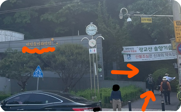 주차 후 길 건너편에 반딧불이 화장실이 크게 있습니다. 등산 전 화장실 다녀오시고, 나오면 돌계단이 있습니다. 돌계단으로 진입하면 등산 시작! (입구 : 빨간 화살표)