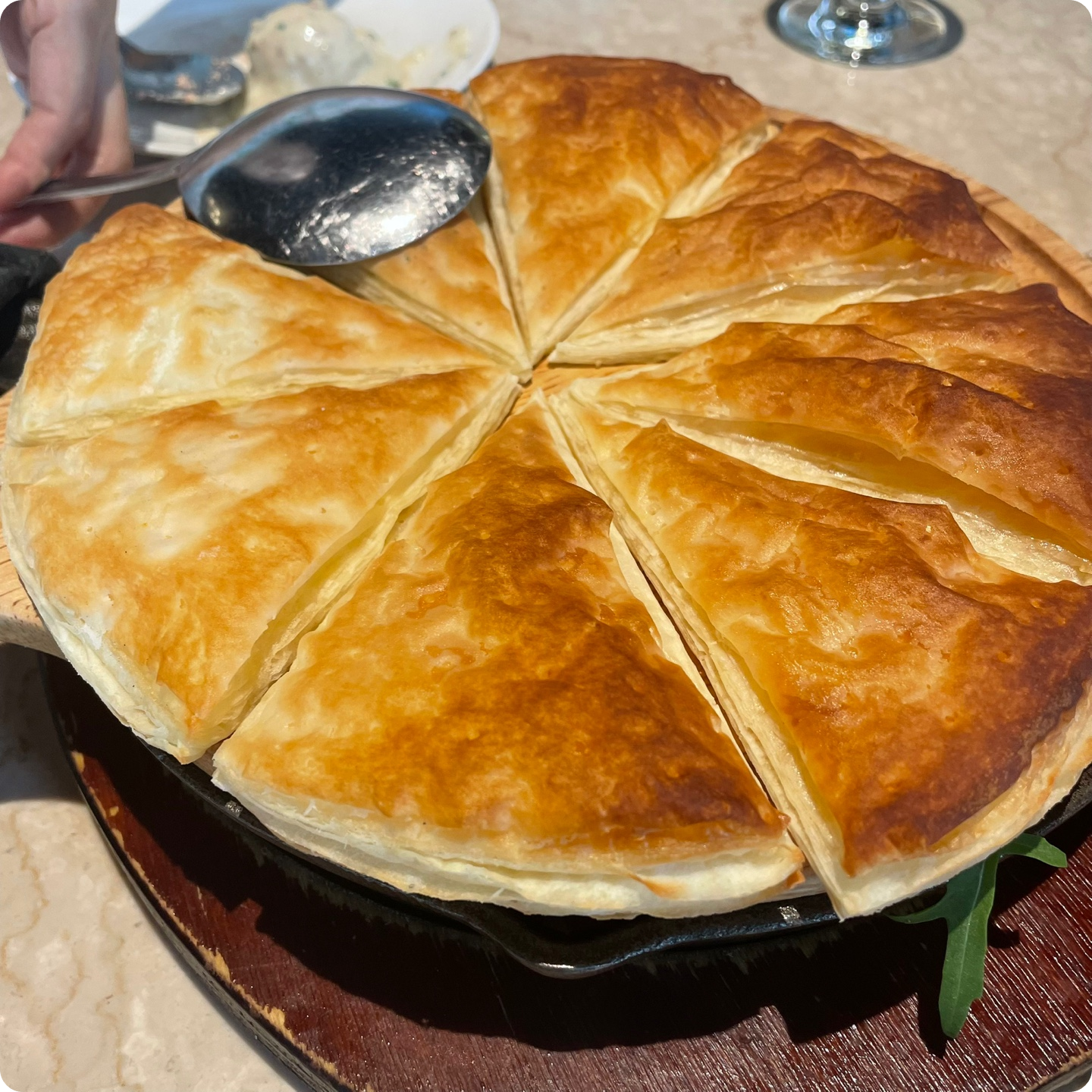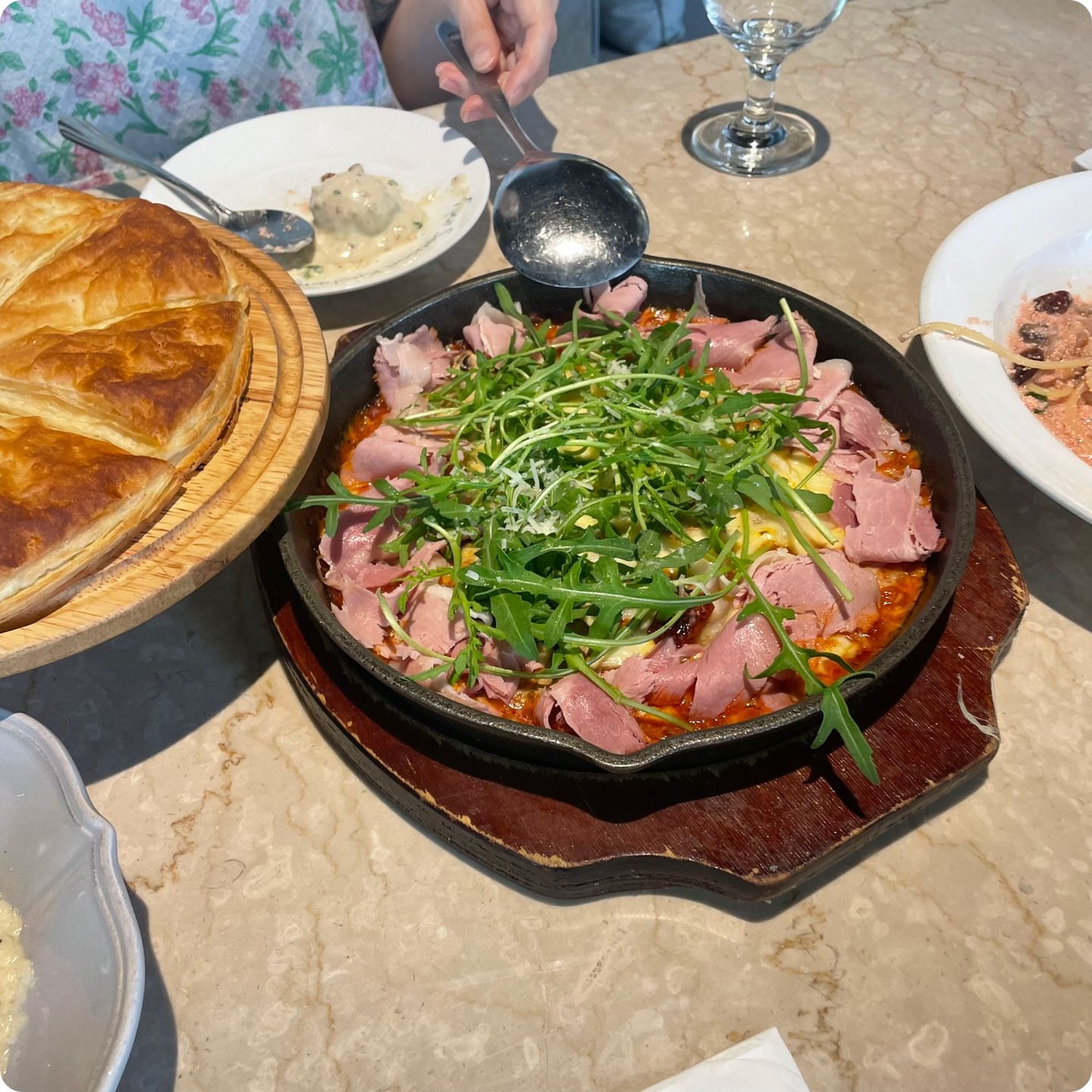 이렇게 피자 내용물이 팬에 깔려있어요. 그럼 저 패스츄리 뚜껑을 뜯어서 자기 접시에 놓고, 내용물을 얹어서 먹거나 싸서 먹거나 하는 거래요. 총평 : 맛은 그냥 피자맛, 먹기 불편함. 그냥 신기한 피자를 경험해봤다는데 의의를 둡니다.