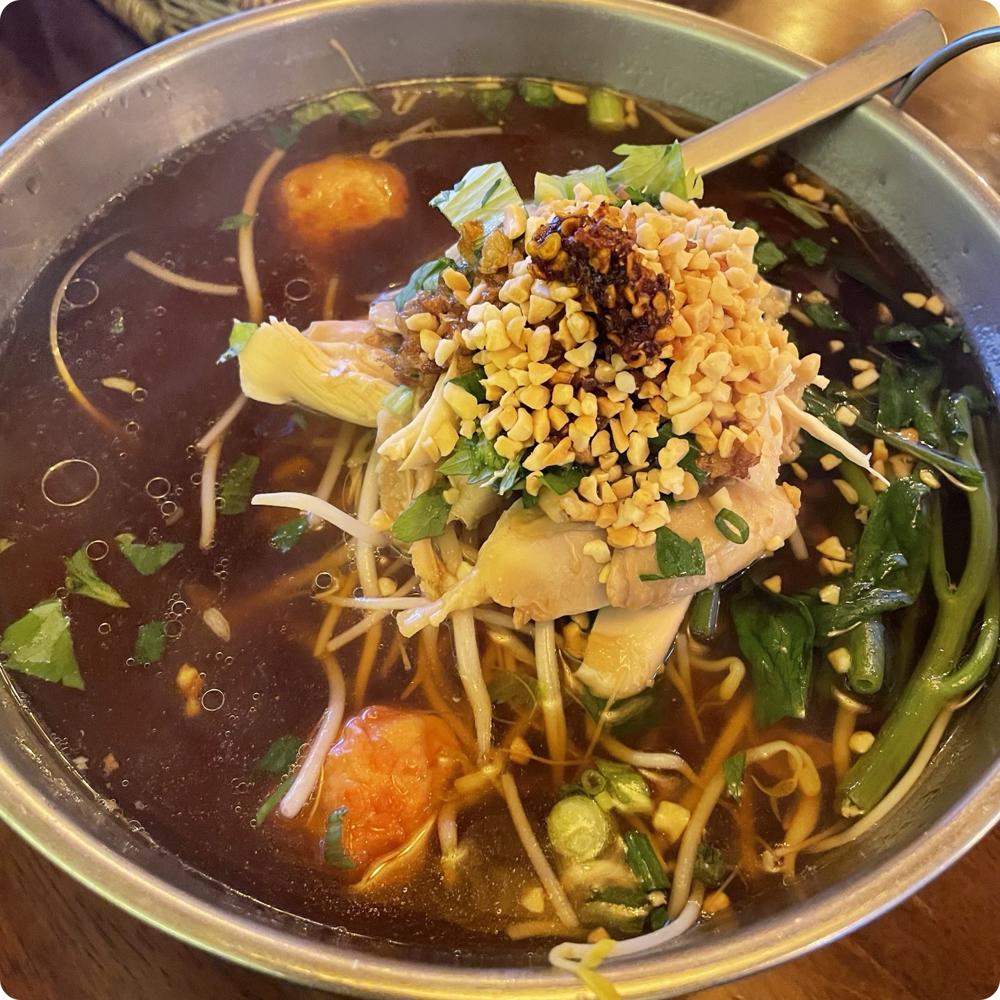 처음에 국물 색보고 팥죽인줄 알았습니다. 베트남 쌀국수랑 다르게 국물 색이 진하고 향신료 맛이 더 강합니다. 뭔가 보약향이 났어요ㅋㅋ 간이 좀 쎘지만 잘 먹었습니다. 꾸에띠어우까이가 닭고기래요, 닭고기 쌀국수였습니다. 근데 저기 동동 떠있는 완자같은데 정말 맛있었어요.