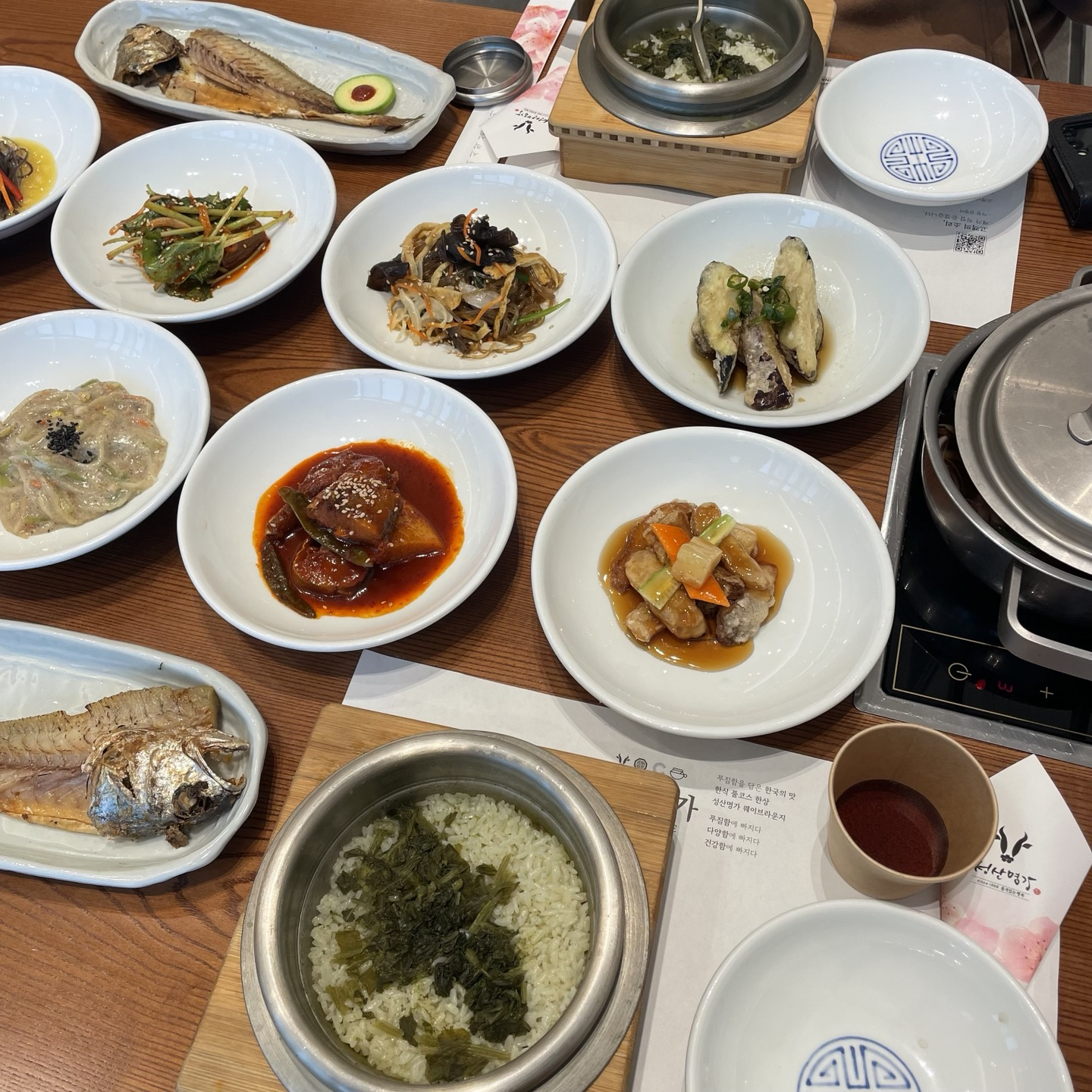 솥밥과 인당 생선구이 하나씩, 불고기 전골이 같이 나오고 반찬류도 다양하였습니다.