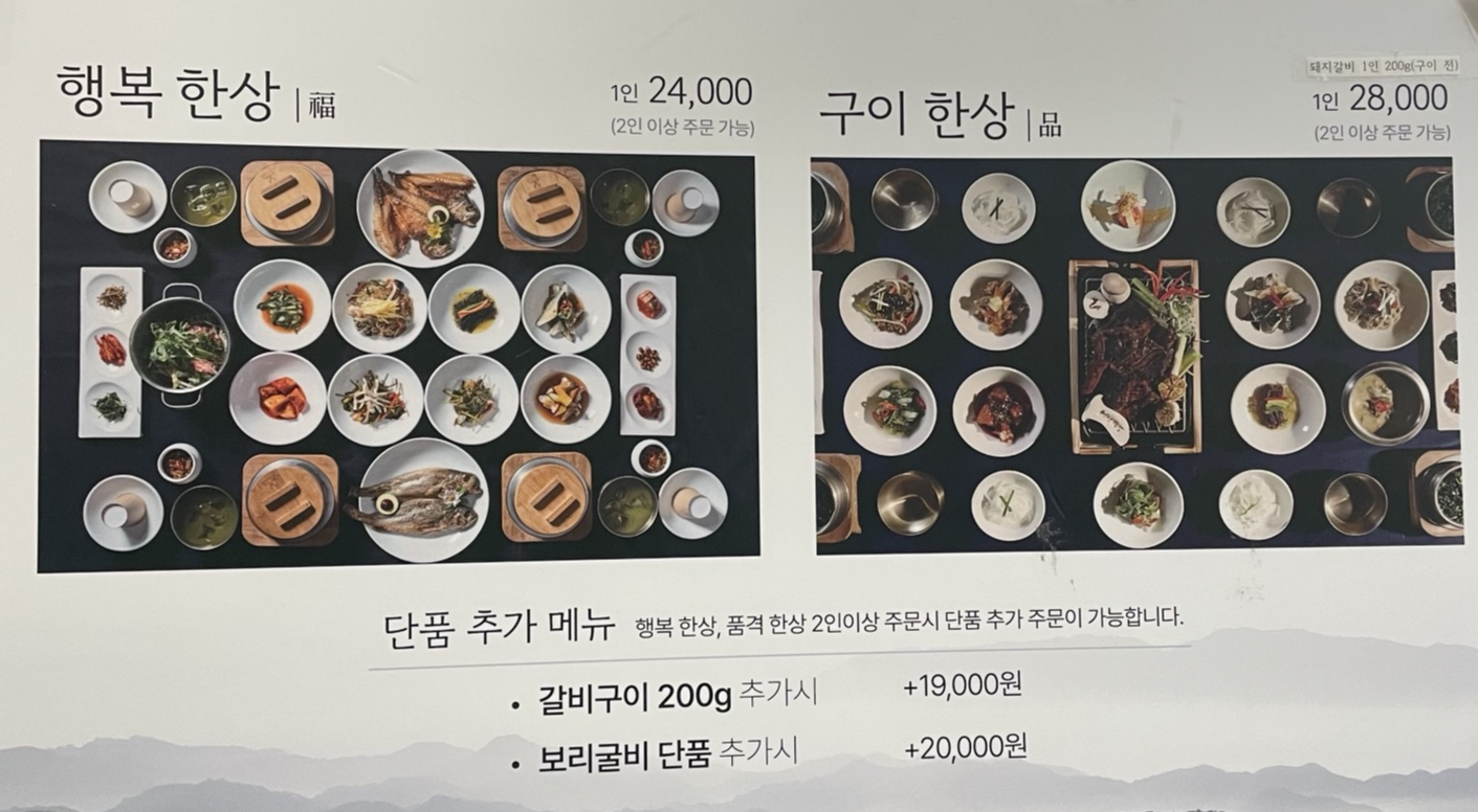 대표메뉴 : 행복한상 (1인 24000원), 구이한상 (1인 28000원), 최소 2인 이상