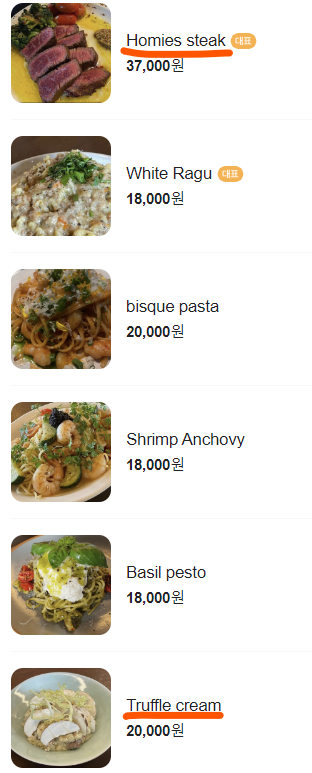 저희는 호미스 스테이크 (Homies steak), 트러플 크림 리조토 (Truffle cream) 랑 제로콜라를 주문하였습니다.