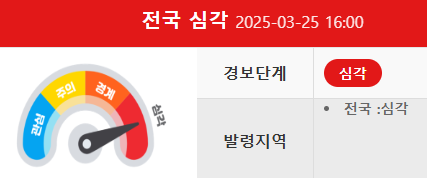 관심, 주의, 경계, 심각 4단계로 나누어지며 발령 지역까지 표기가 됩니다.
