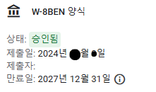 승인 후에 미국 세금 정보가 등록되었다는 메일이 오고, 미국 세금 정보 상태가 "검토중"에서 "승인됨"으로 바뀝니다.