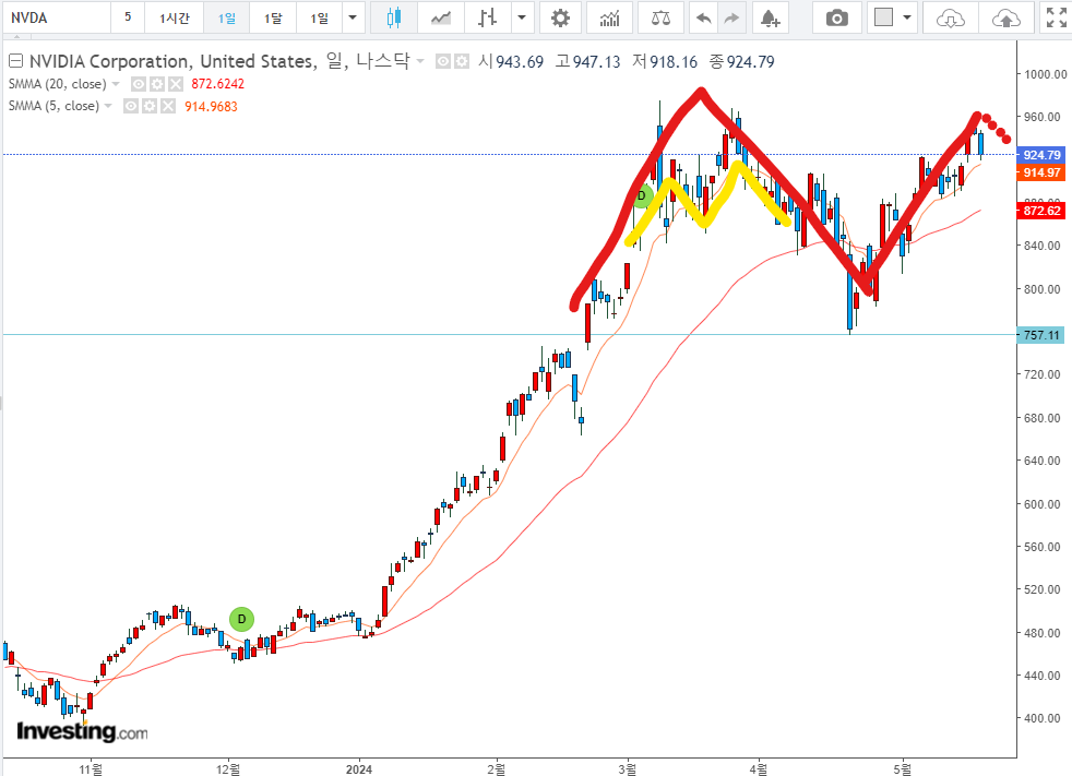 6개월 일봉차트입니다. 4월의 조정으로 20일선을 살짝 이탈하였으나 다시 회복하였습니다. 미니 헤드앤숄더 패턴(노란색) 이 보이고, 크게 헤드앤숄더 패턴(빨간색)이 한번더 보입니다. 헤드앤숄더 패턴이 나타나면 주의해야합니다. 아마 실적이 탄탄해서 하락 추세로 전환되지는 않을 것 같긴하지만, 저의 경우 실적 확인 후 주가 상승시 홀드, 5일선 이탈시 20% 익절, 20일선을 깬다면 전액 매도로 계획을 세웠습니다.