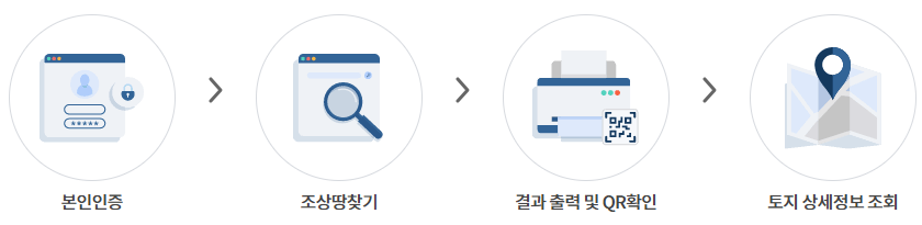 조상땅 찾기 버튼 클릭 후 본인인증 -> 조회 대상자 정보 입력 후 신청 -> 신청기관 담당자 승인 후 조회 가능