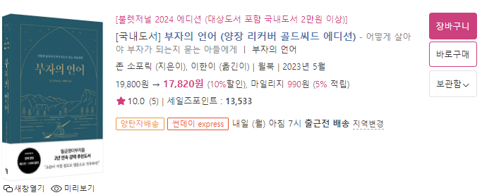 아무튼! 오늘 리뷰할 도서는 유명한 재테크 커뮤니티인 월급쟁이 부자들의 추천도서인 "부자의 언어"입니다.
