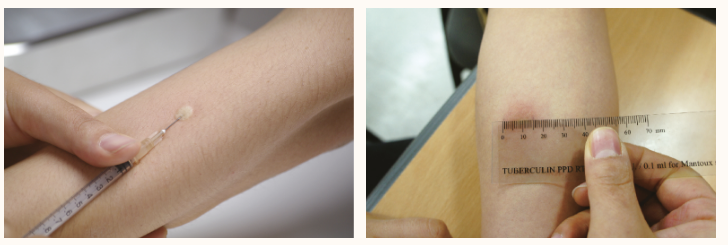 피부반응 검사는 투베르쿨린 용액을 팔 안쪽 피부에 피내주사해서 2-3일 후 경결반응을 측정합니다.