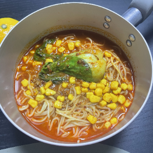 2) 토마토탕면 소스와 물 120ml (종이컵 2/3)를 담고 옥수수, 청경채와 끓입니다.