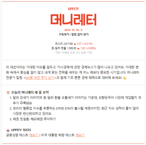 최근에는 머니레터와 잘쓸레터로 구분하여 메일을 보내주시는데, 머니레터는 원래 그대로 경제뉴스를 다루고 있고 잘쓸레터는 행사,축제,일상,최근의 화제 등을 다루더라구요. 아래 링크로 접속하셔서 메일과 이름만 등록하면 구독완료!