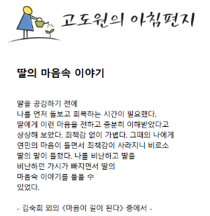 제가 초등학생일때부터 고도원의 아침편지를 구독하였는데 아직도 매번 좋은 글귀를 보내주십니다. (찾아보니 요새는 앱도 나와있더라고요.)