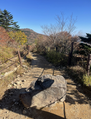 영신봉 표지판 앞에 갑자기 이런 큰 돌이 있어요. 그럼 진짜 거의 다온 것입니다. 소리 질러~!