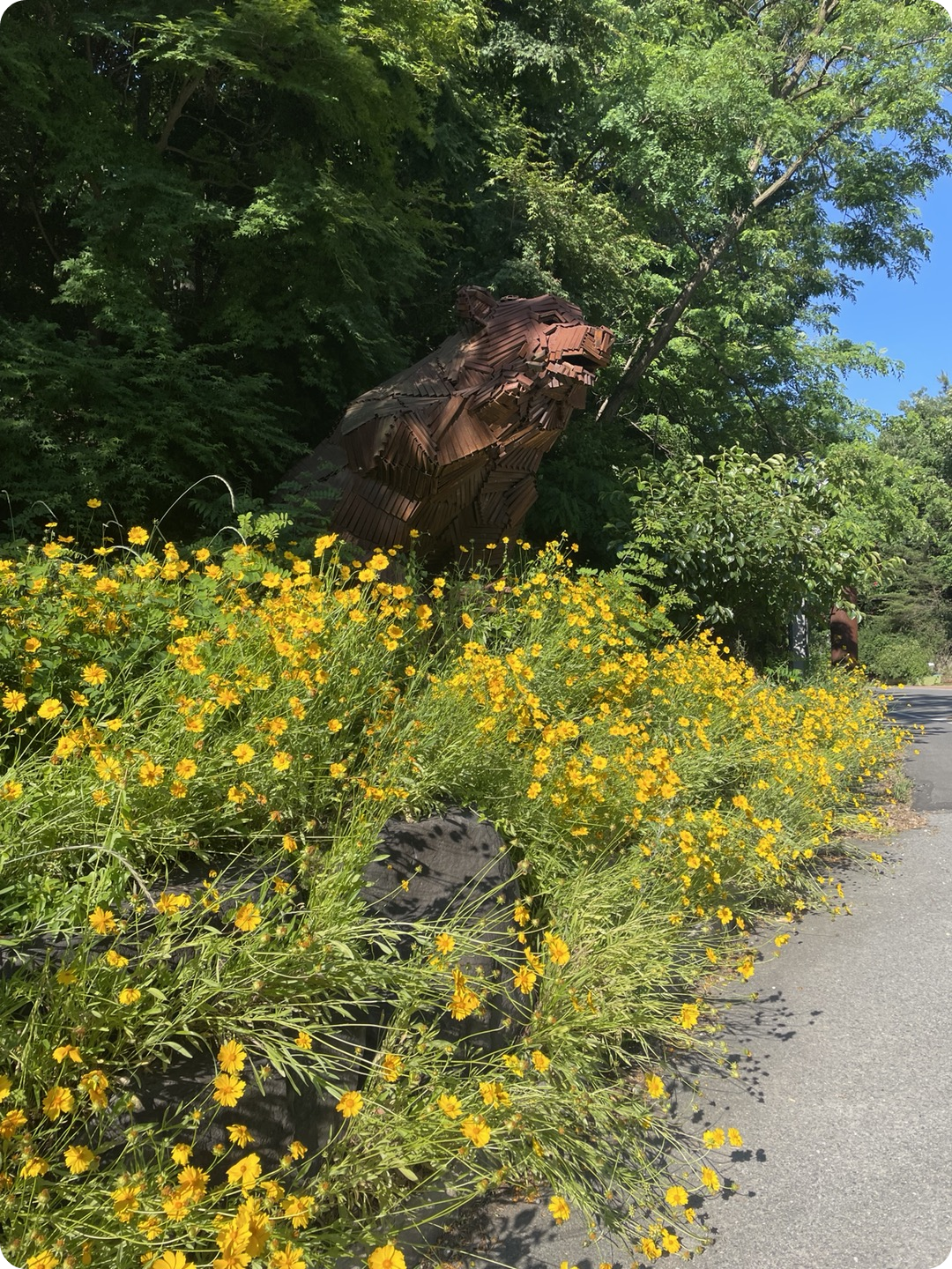 주차하자마자 보이는 꽃밭과 곰 조형물을 보고 사진 한 컷 찍고 길 건너 입장합니다.