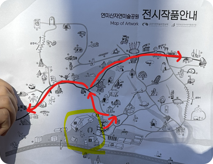 근데 티켓오피스에서 주신 지도로는 너무 넓어보여서 마음이 급했는데, 생각보다 작품이 한다리 건너 있어서 저렇게 광범위(?)하지 않습니다. 한시간걸렸는데 주요 작품들 넉넉하게 사진찍고 다 돌아볼 수 있었어요. 결론적으로 한시간걸려서 빨간 루트 말고 다른 작품들도 다 보고 나왔어요! 그리고 메인 작품만 보고싶으시면, 걷는 길에 <작품감상로>라고 큰 표지판이 있으니 지도가 없어도 잘 다니실 수 있습니다.