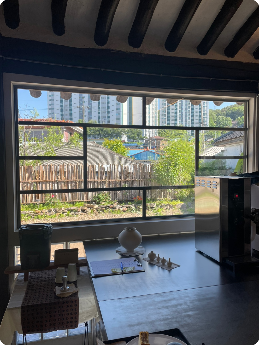 저기 장독은 안에 밤 크림 브륄레가 들어있어요. 공주가 알밤이 유명하잖아요~~ 그래서 크림브륄레 밑에 밤 덩어리들이 깔려있는데 많이 달지 않고 고소하니 맛있었어요. 저 옥수수 디저트는 찰옥수수 아이스크림맛!!