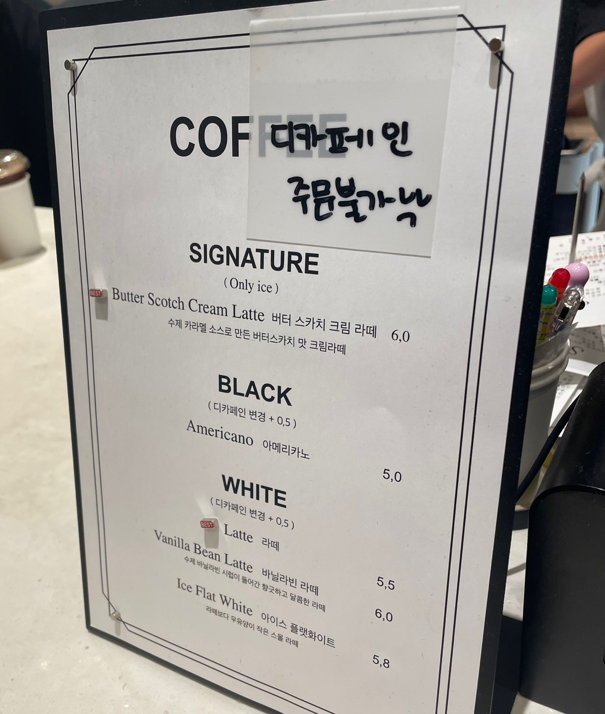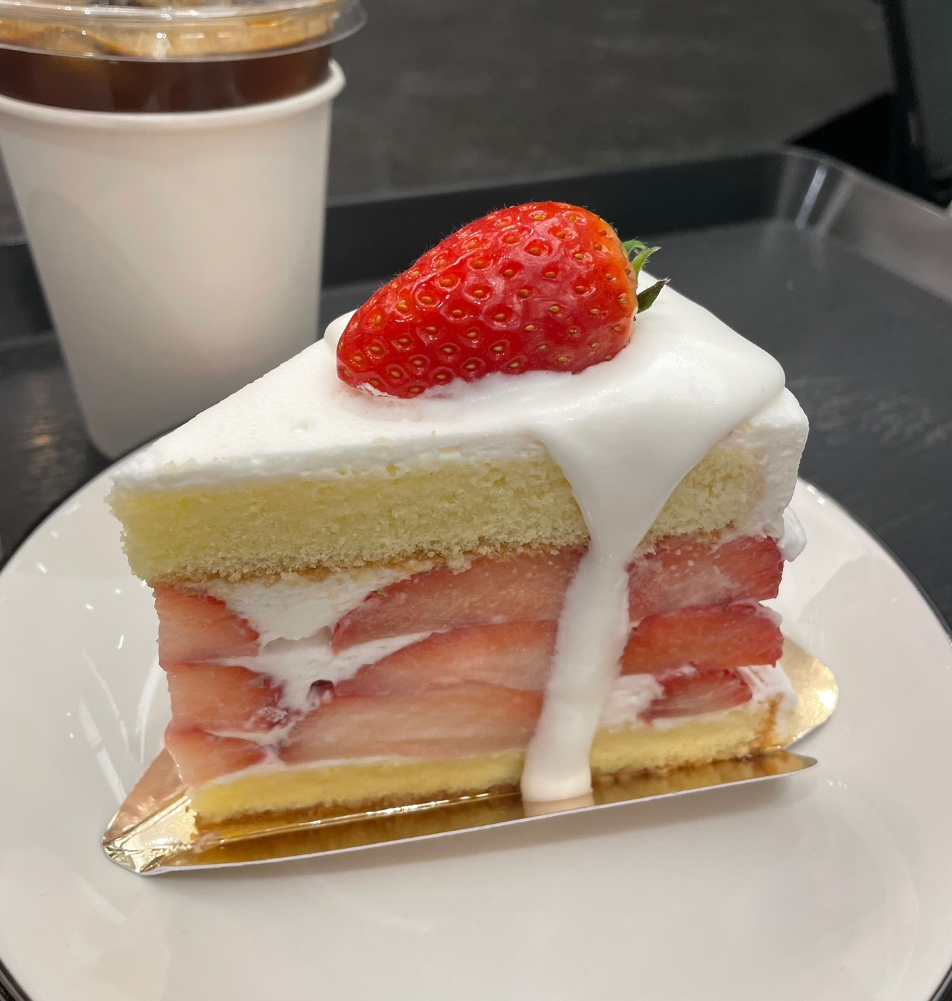 스타필드 국룰인 별마당 도서관을 보고 주변 카페를 찾는데, 온통 만석이다. 결국 6층에서 1층까지 낙하하여 자리 비는 곳을 찾았다. 두자리를 겨우 발견하고 가방찬스로 자리를 맡은 뒤 주문하러 왔는데 딸기 케이크가 너무 맛있어 보이는 것이었다. 당연히 못참고 아이스 아메리카노 두 잔과 생딸기 케이크 하나를 주문하였는데, 역시 시그니처였군. (생긴게 범상치않음)