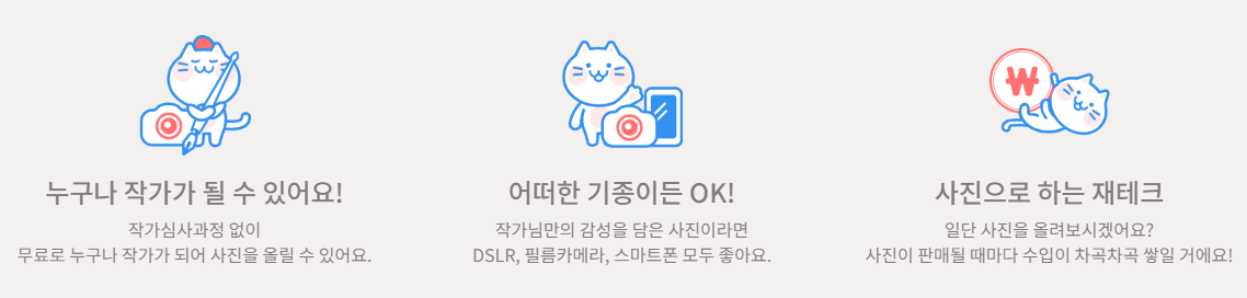 크라우드픽이란 본인이 촬영하거나 제작한 이미지를 판매하는 사이트입니다. 크라우드픽에 작가로 등록, 승인되면 수익 창출이 가능해집니다. DSLR로 촬영한 사진부터, 간단하게 자신의 휴대폰으로 촬영한 사진까지 제한이 없습니다.