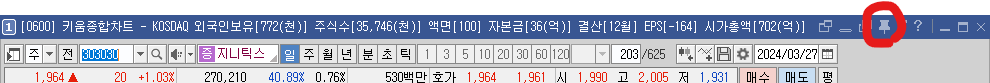 빨간 동그라미 보시면 압정같은 아이콘에 자물쇠가 그려져 있죠? 이러면 종목을 클릭했을때 차트 연동이 되지 않습니다.