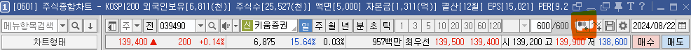 600은 현재 화면에서 최대로 표시할 수 있는 봉(캔들)의 개수입니다. 상장한지 오래된 종목들은 이 캔들의 개수가 엄청나게 많겠죠? 저도 처음에는 600개에서 어떻게 더 늘리는지 몰라서 헤맸던 기억이 납니다.