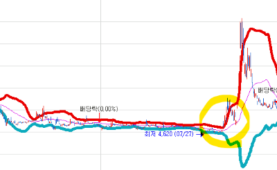 그럼 차트상에 이렇게 볼린저 밴드가 그려집니다.