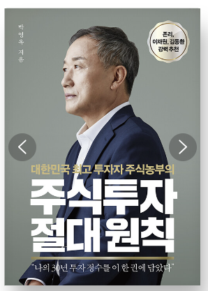 그래서 <주식투자 절대원칙> 초반부터 작가의 인사이트에 공감하기가 매우 어려웠다. 국내 주식에서 진득하게 가치 투자를 한다는게 선뜻 내키지 않았기 때문이다. 지금 삼성전자 주가가 6만 원대, 2020년도 가격으로 회귀한 상태이다. 물론 저자도 매도 없는 초장기 투자는 지양한다고 하지만, 그래도 우리나라 시총 1위 기업마저 박스피를 면치 못하는데 어떻게 저평가된 국내 기업을 찾아서 믿고 견딜 수 있을까? 그래도 최근에 기술적 분석위주로 공부를 하다가 오랜만에 가치투자에 대해 쉽게 쓰여있는 책을 읽다 보니 신선하긴 하였다. 게다가 이 책의 저자는 본인의 가치 투자 방법으로 천억대 자산가가 되었다고 하니 당연히 그의 인사이트를 배워야겠다고 생각했다. 내용 자체는 매우 쉽게 기술되어 있으니 하루정도면 다 읽을 수 있다.