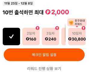 주황색 버튼을 눌러주시면 1일차 출석체크 완료입니다!